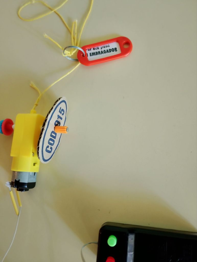 Motor, interruptor, cable, pilas, hilo, plástico, tinta, cartón. 8 x 6 x 3 cm.