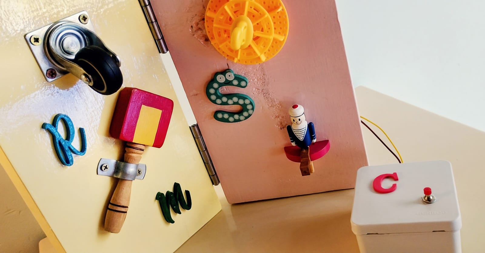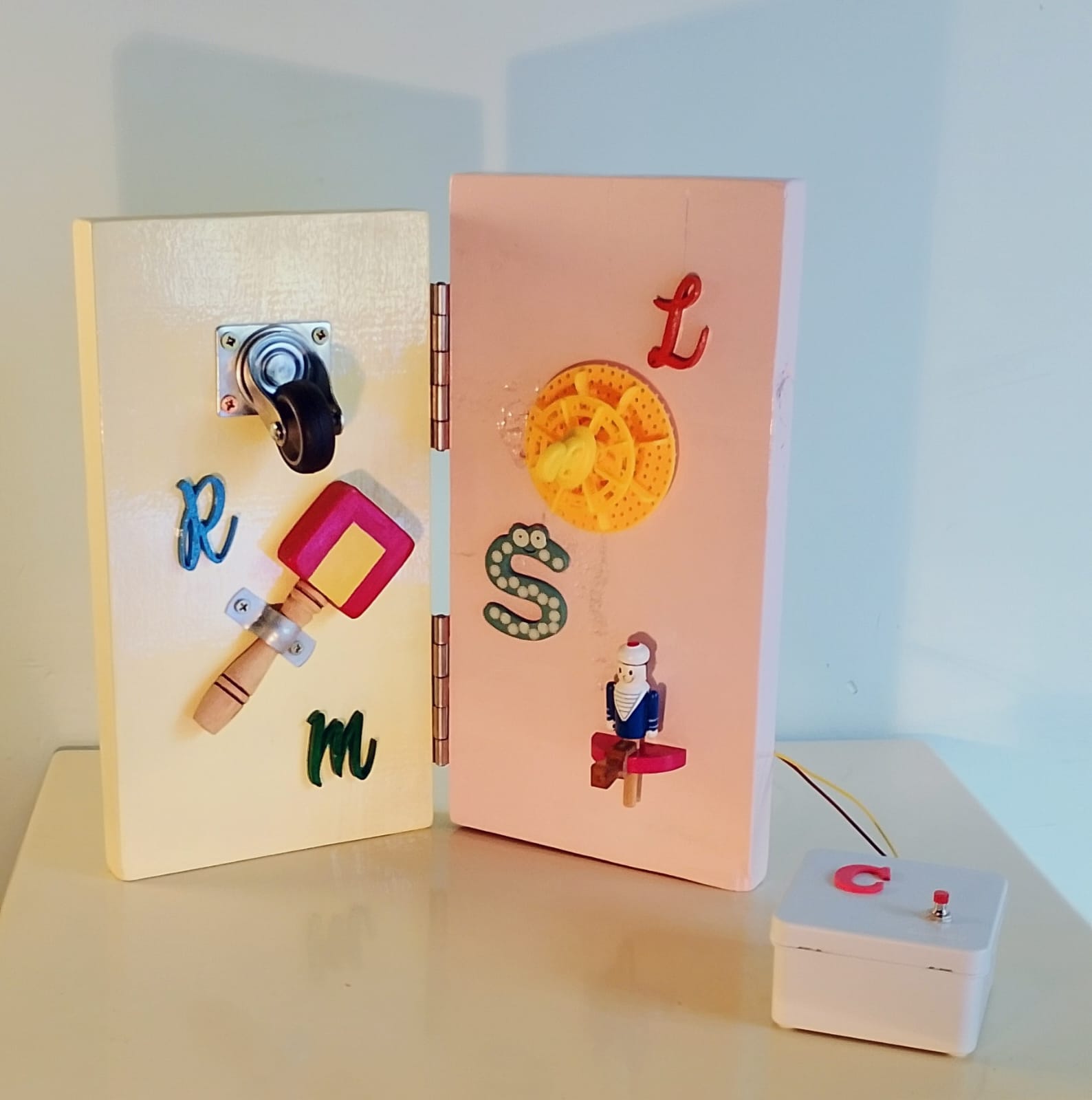 Madera, metal, plástico, motor, cables, interruptor, pilas. 31 x 30 x 11 cm.