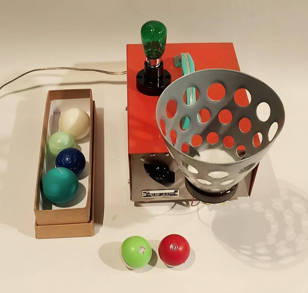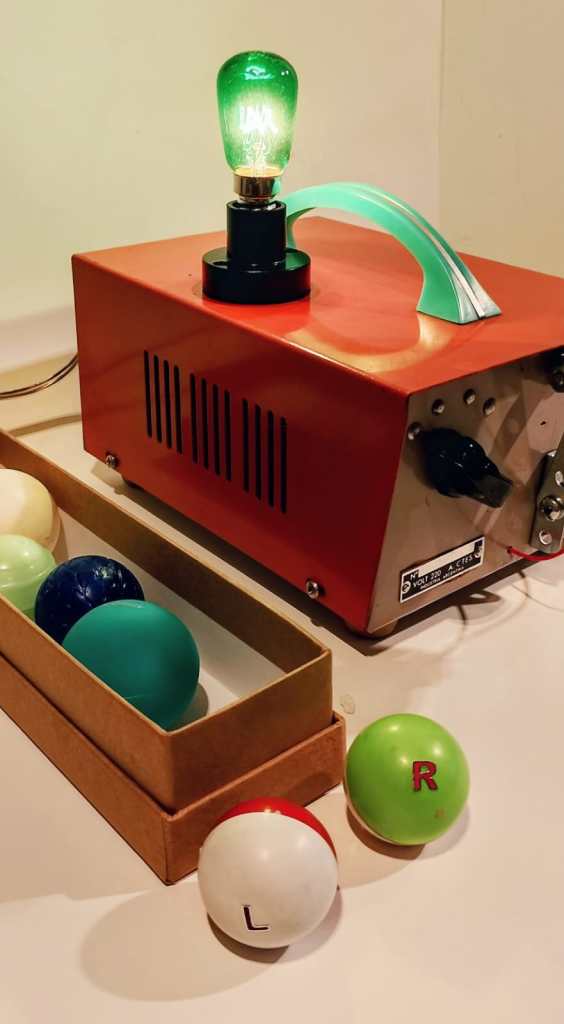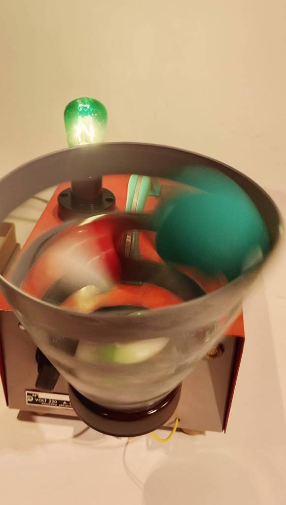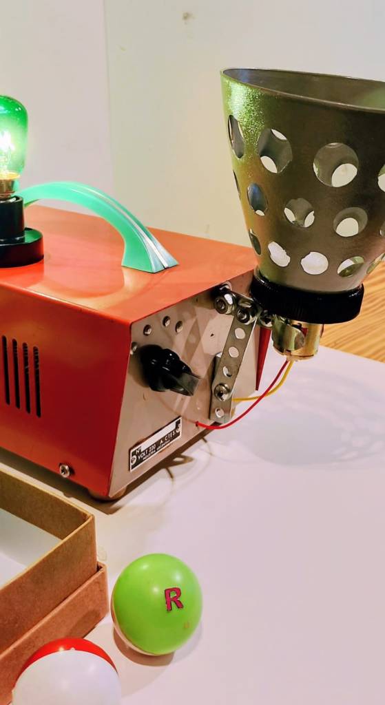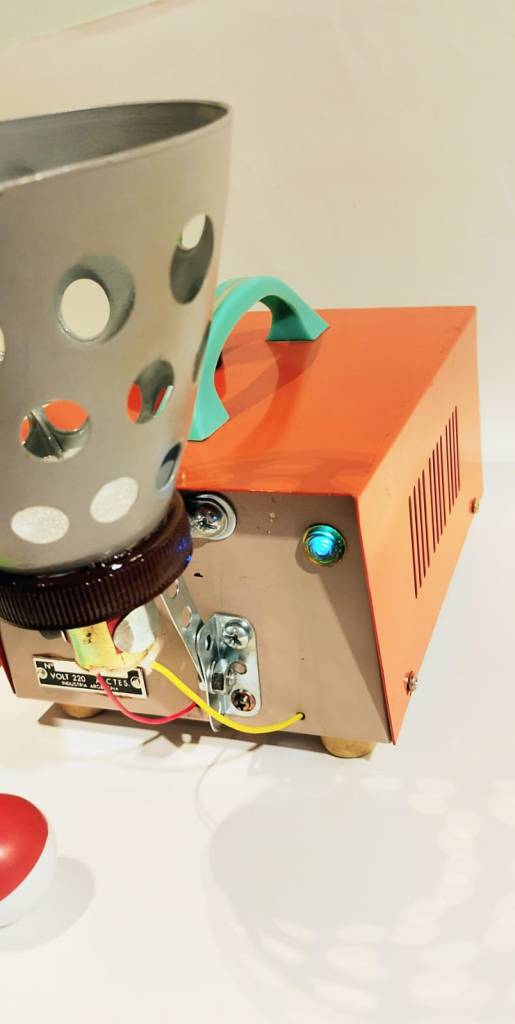 Metal, plástico, vidrio, goma, motor, cables, pilas, led, lámpara, interruptor, enchufe, pintura acrílica. 19 x 13 x 28 cm.